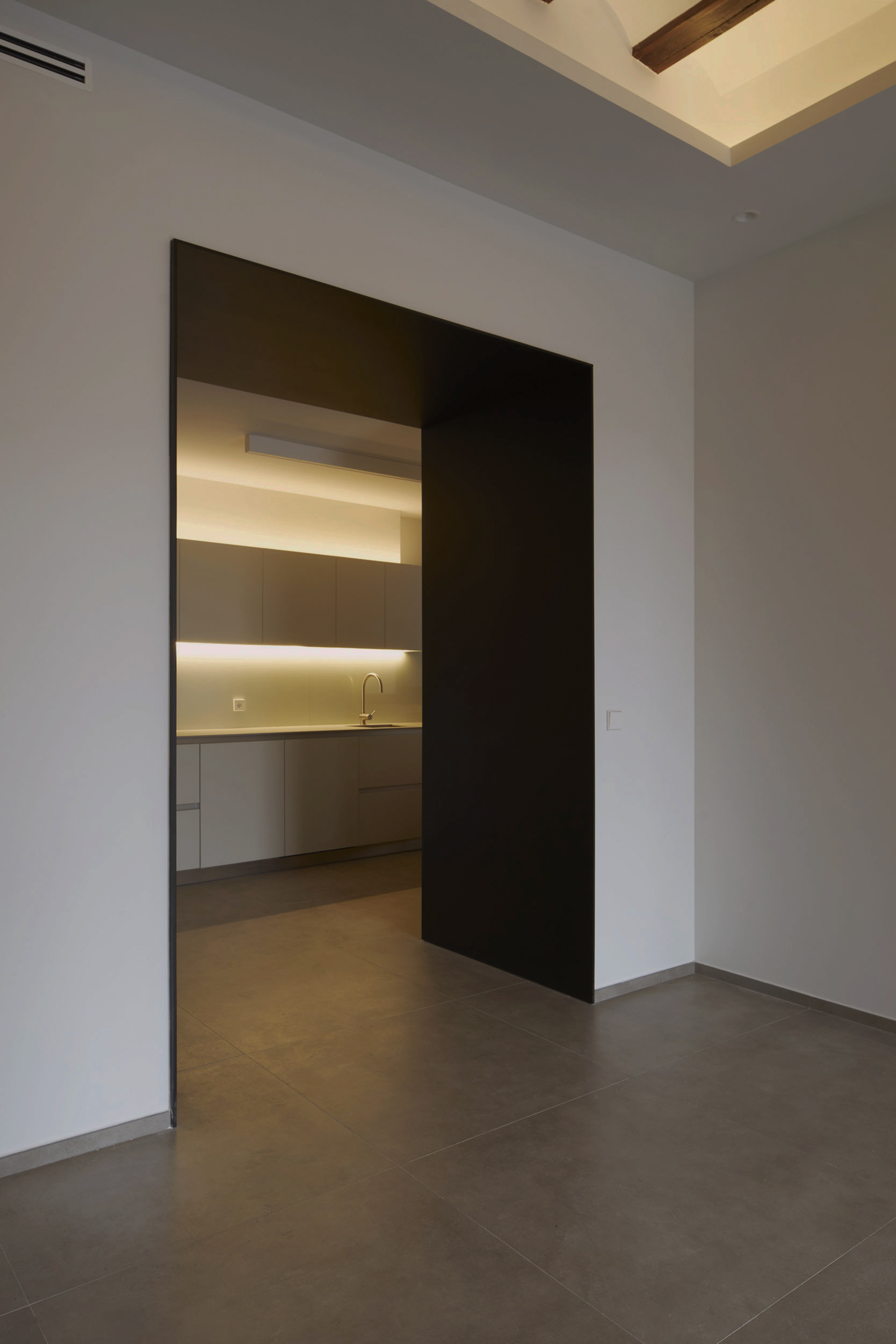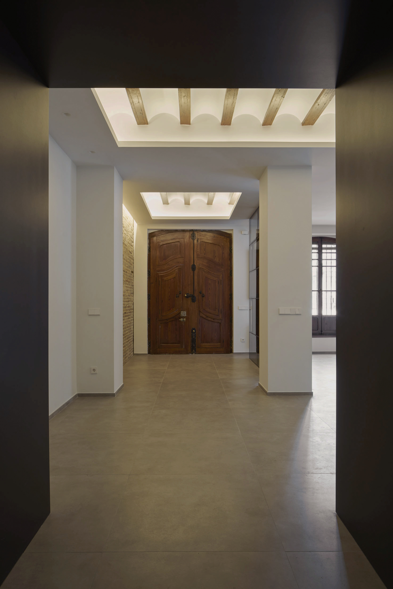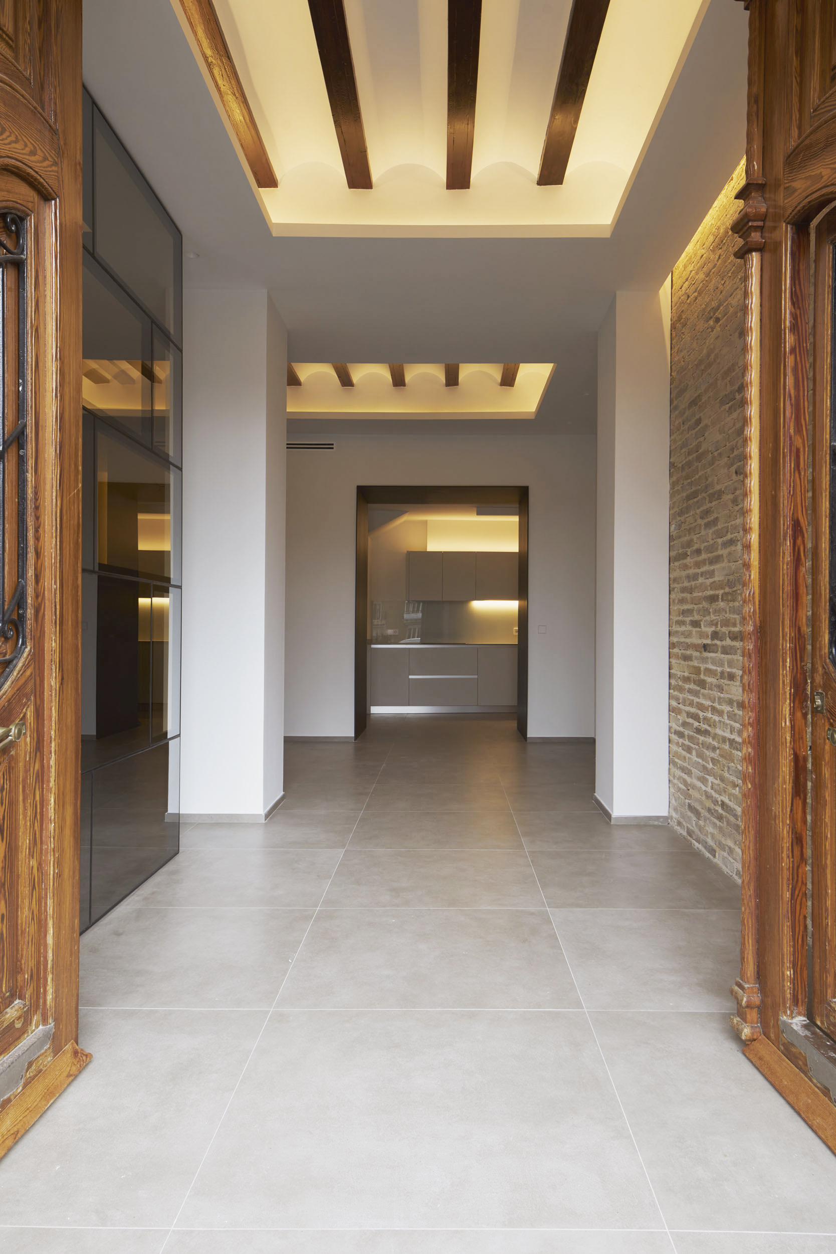 La entrada da acceso a un espacio renovado que convive con elementos del pasado. La zona común, abierta, diáfana, deja ver desde el acceso la cocina, situada al fondo de la planta.