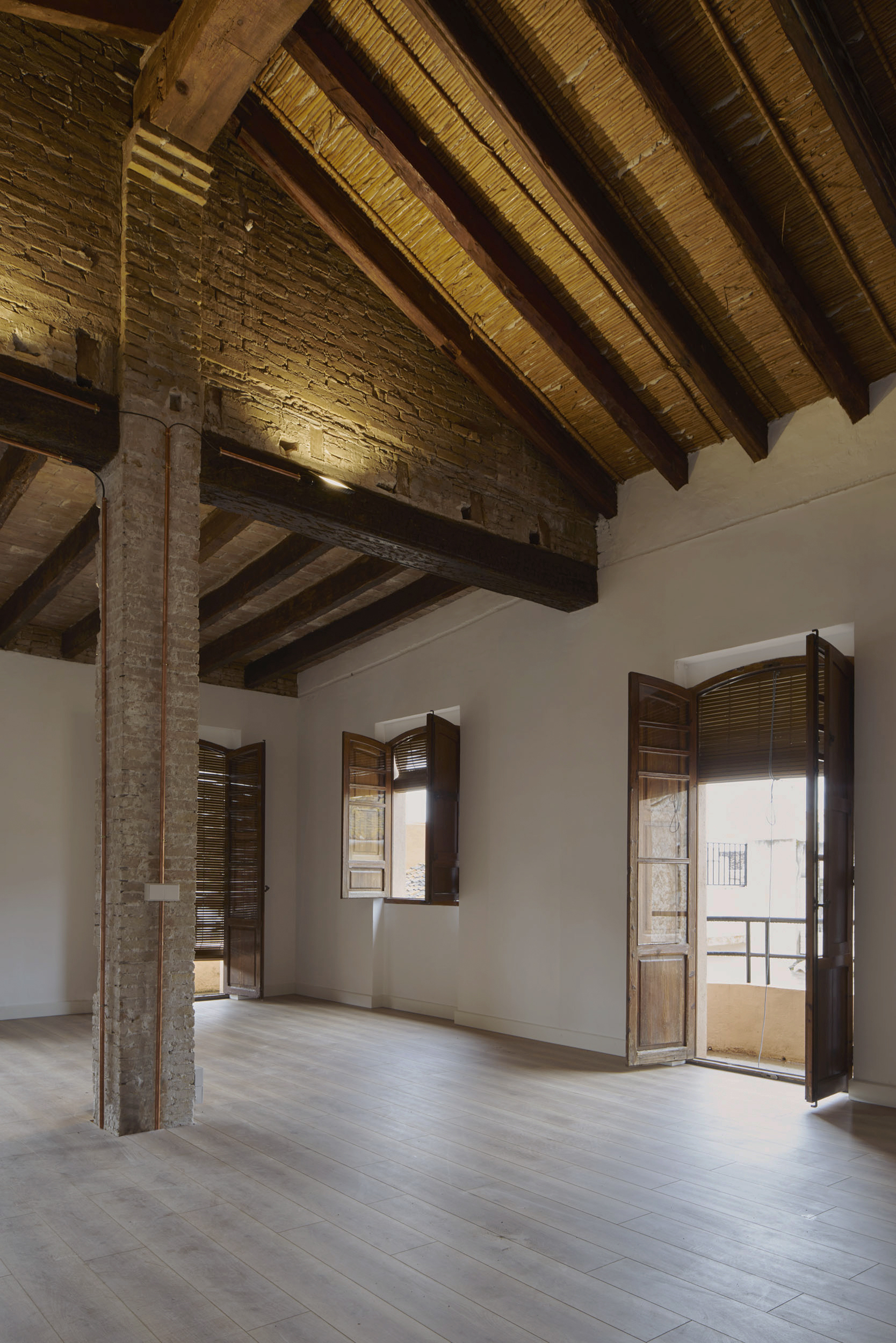En la segunda altura que alberga otra zona común, diáfana en la que, manteniendo el espíritu de la obra, se ha conservado la carpintería original de madera.