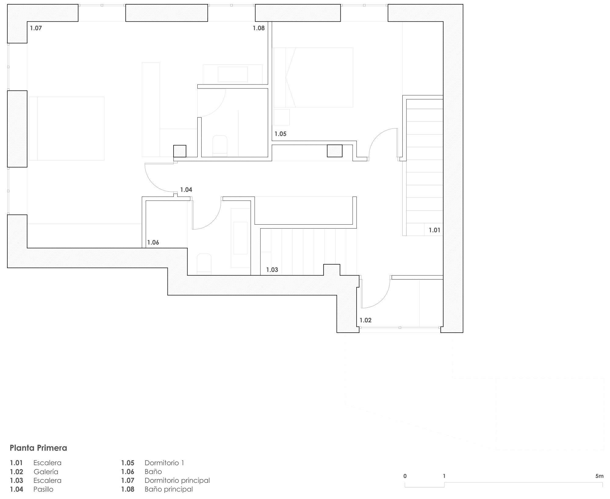 En la primera planta se encuentra la zona privada con los dormitorios y los baños.