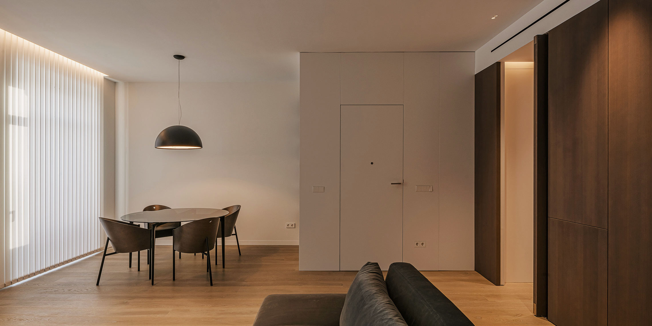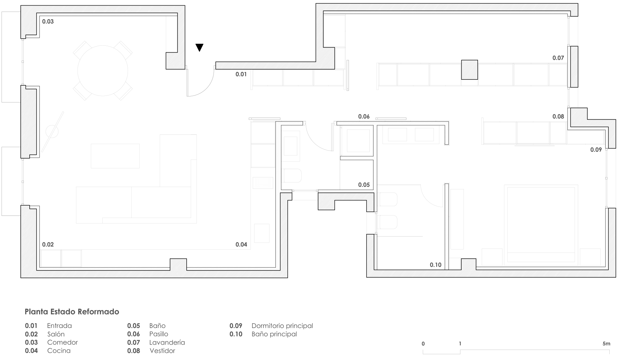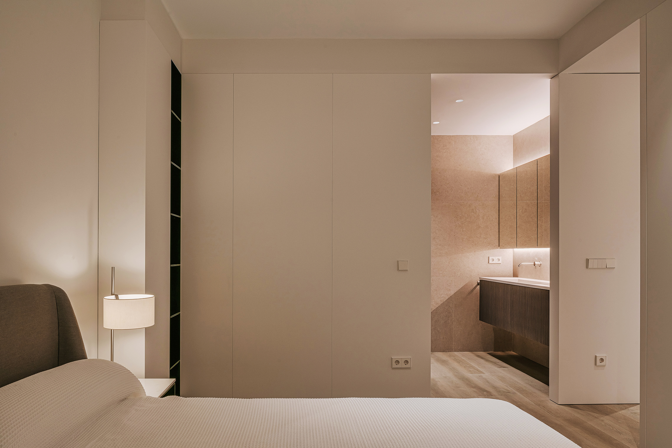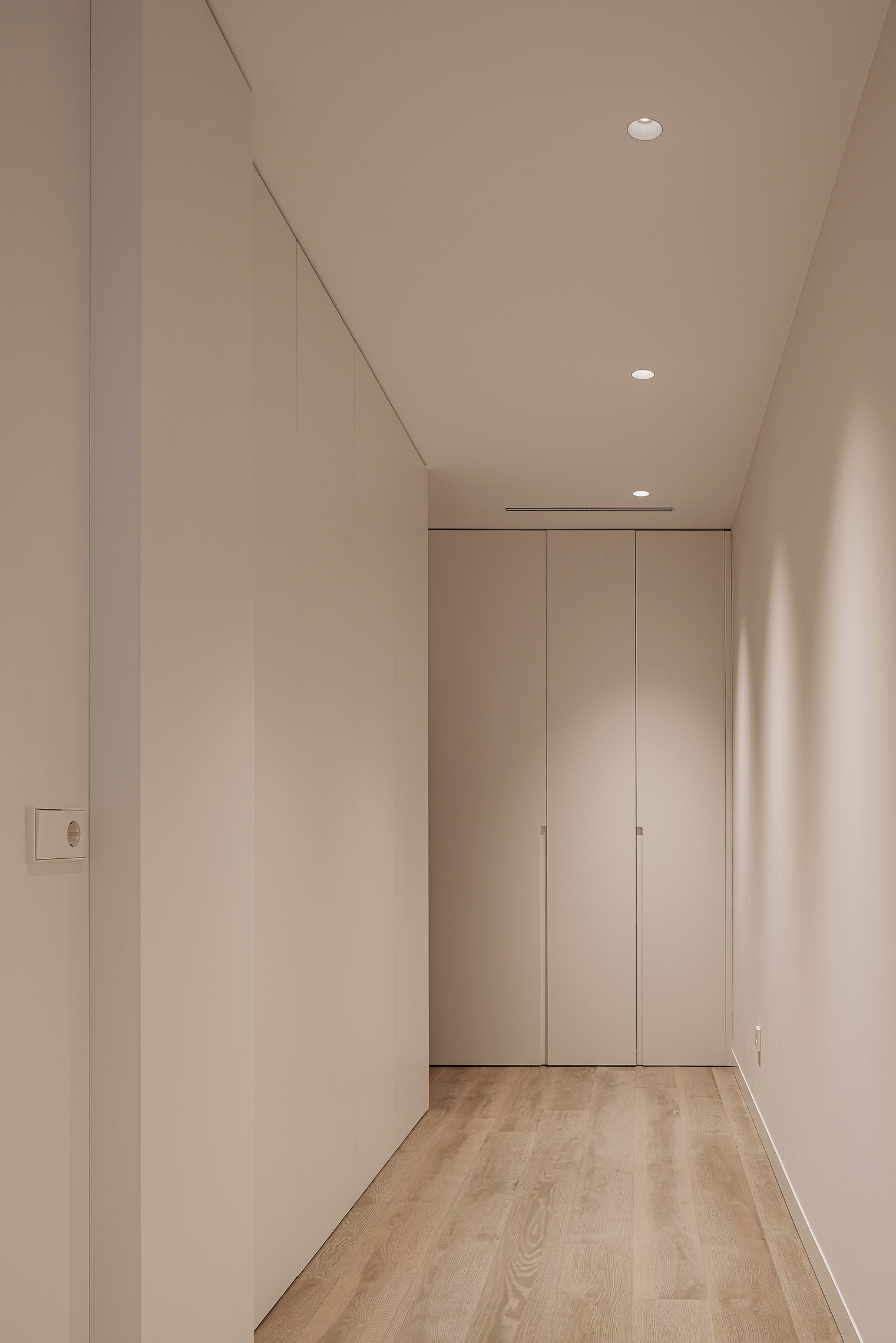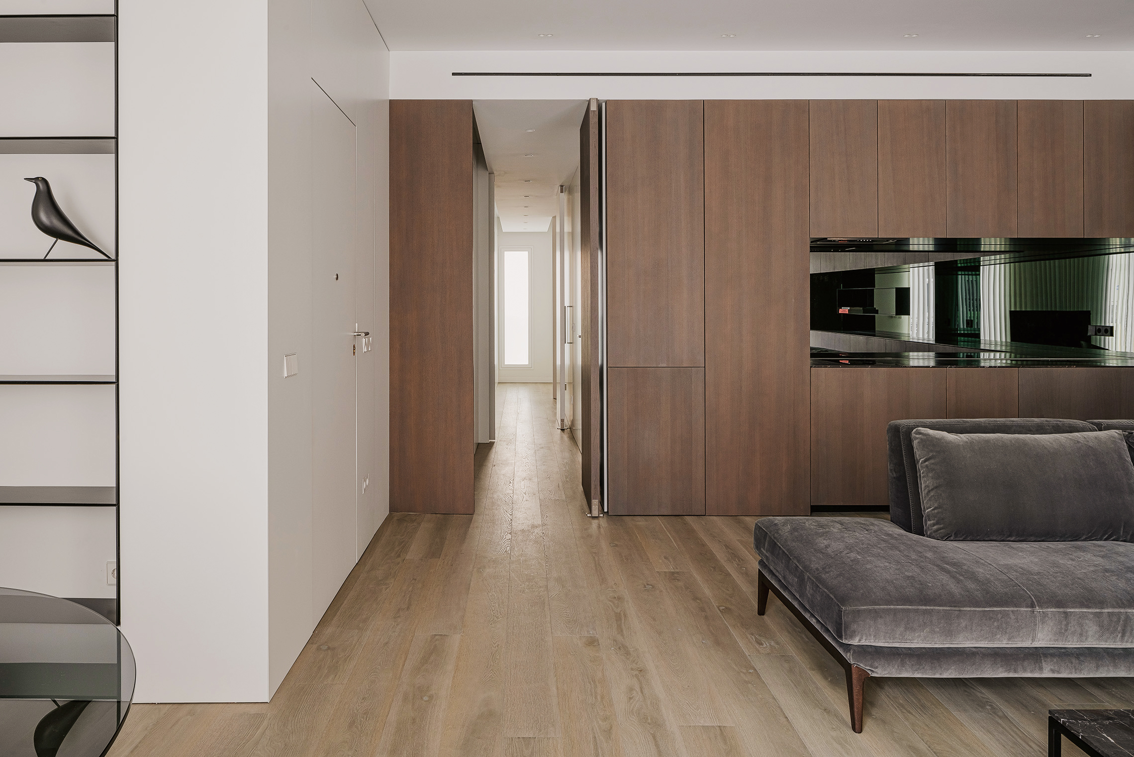 La distribución se realiza totalmente a medida para esta premisa, el pasillo desaparece para pasar a ser el vestidor principal, configurando la vivienda como dos grandes espacios, la zona de estar y el dormitorio principal.