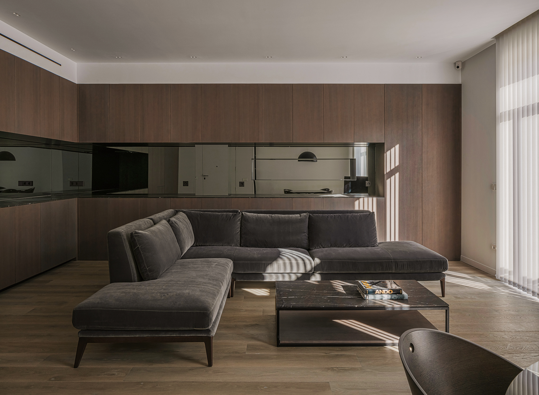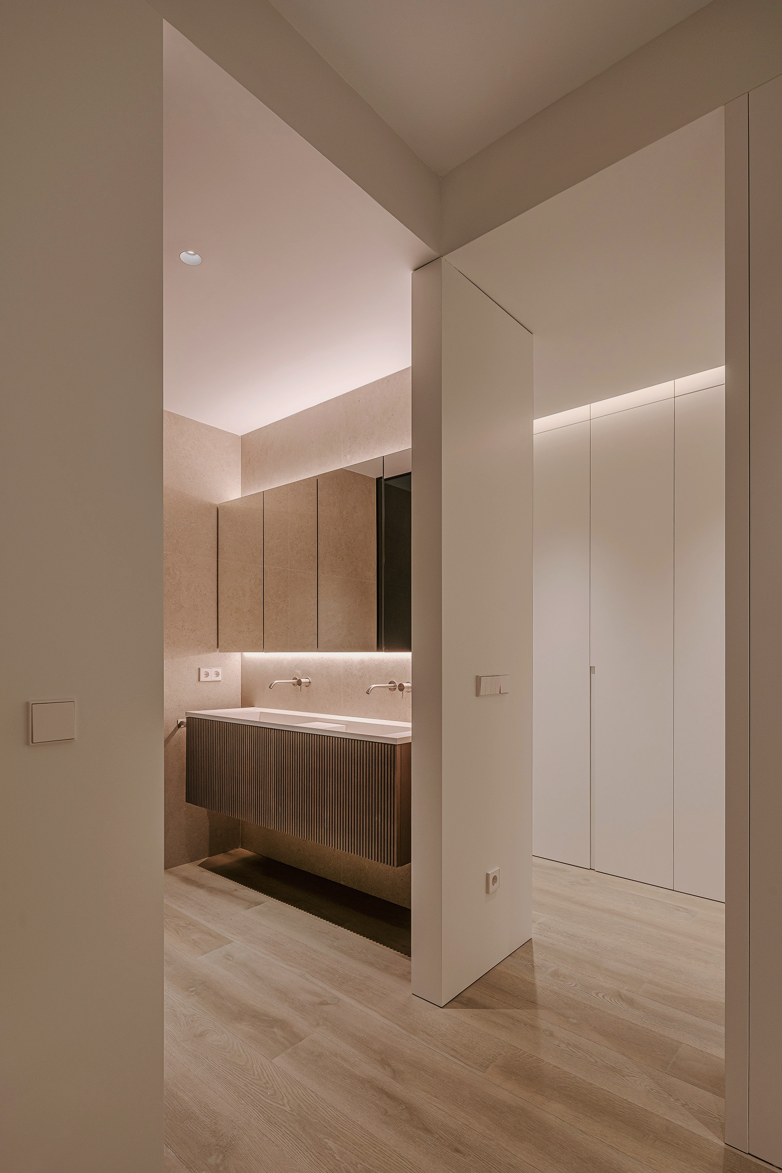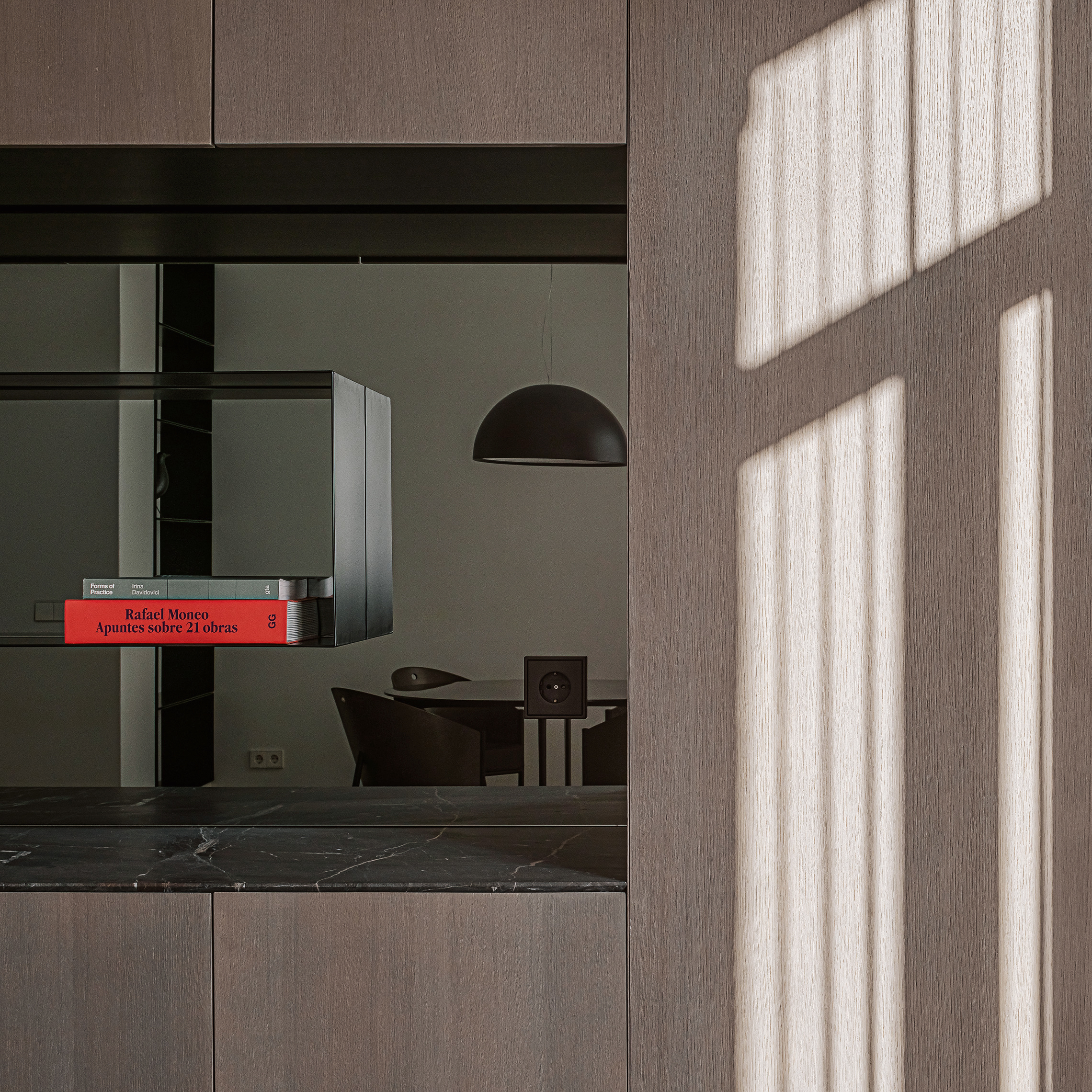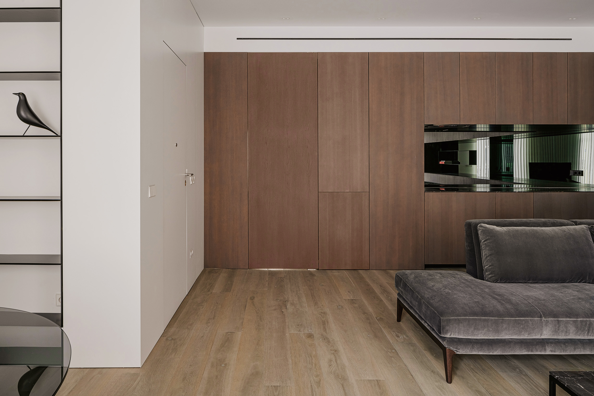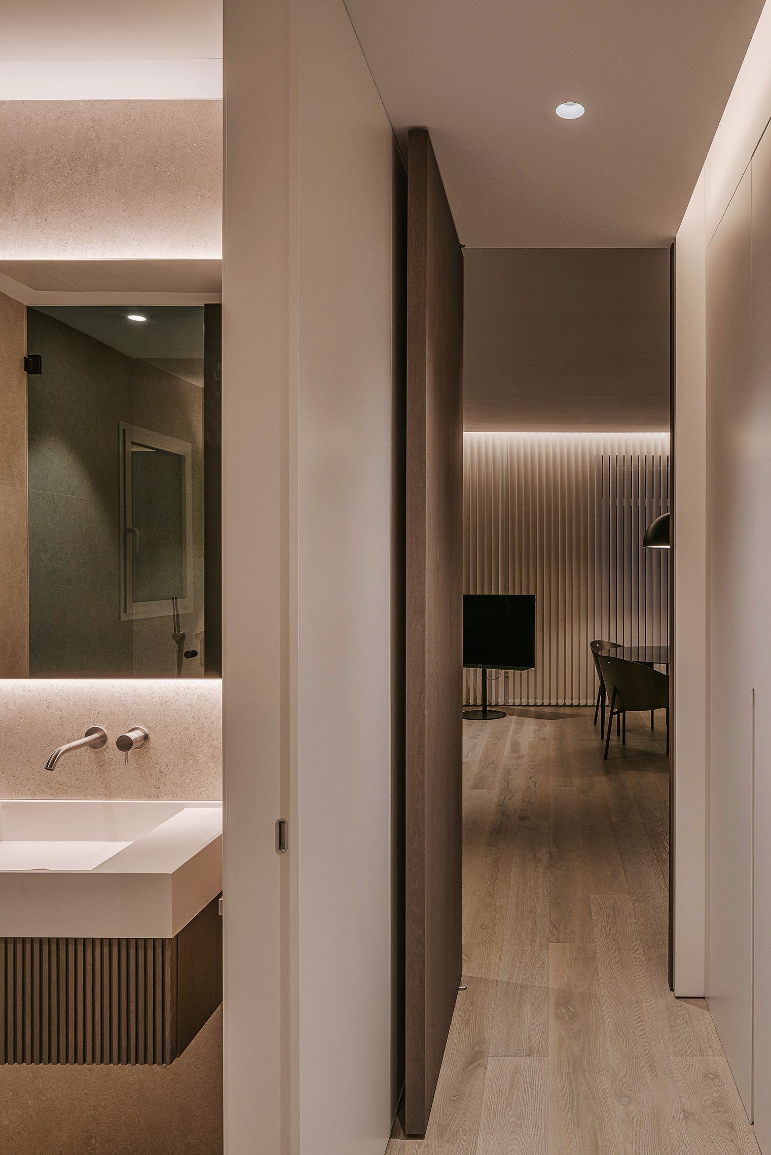 La distribución se realiza totalmente a medida para esta premisa, el pasillo desaparece para pasar a ser el vestidor principal, configurando la vivienda como dos grandes espacios, la zona de estar y el dormitorio principal.