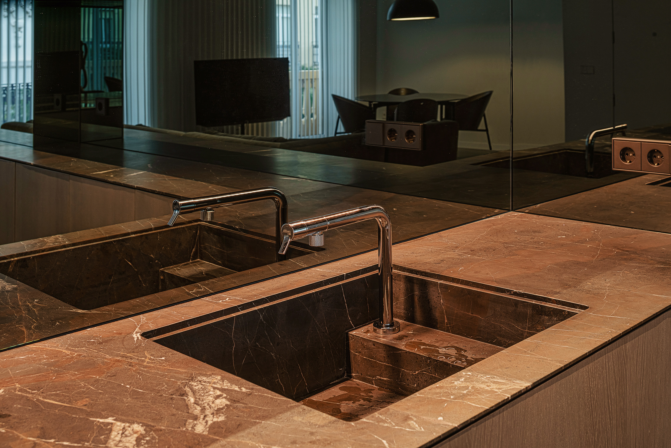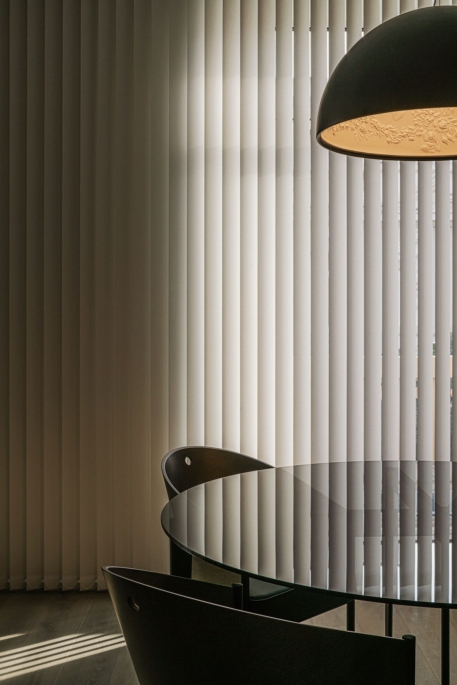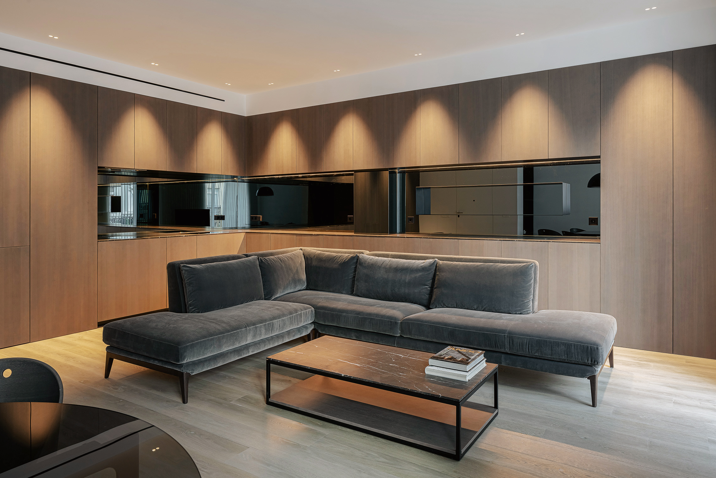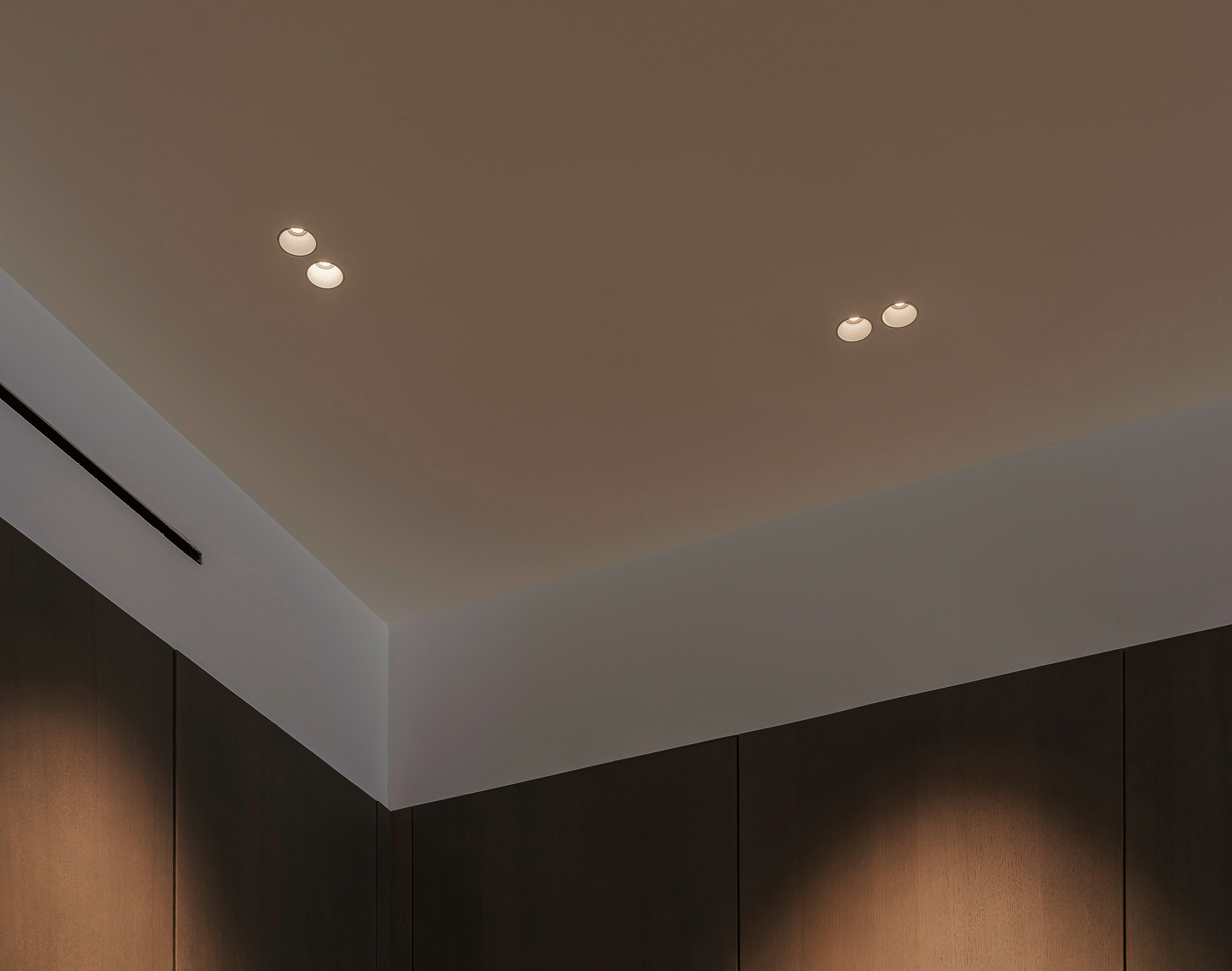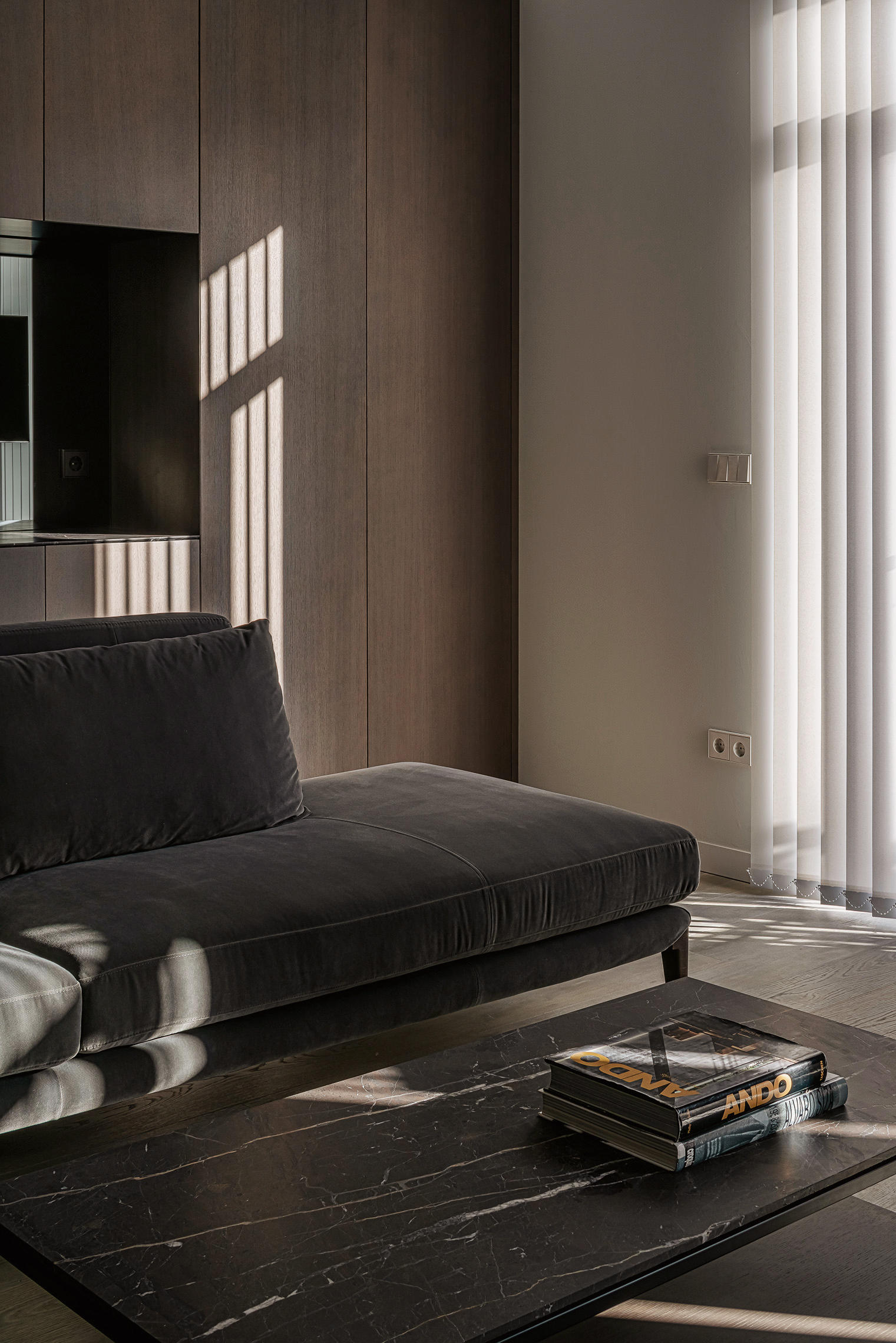 La distribución se realiza totalmente a medida para esta premisa, el pasillo desaparece para pasar a ser el vestidor principal, configurando la vivienda como dos grandes espacios, la zona de estar y el dormitorio principal.